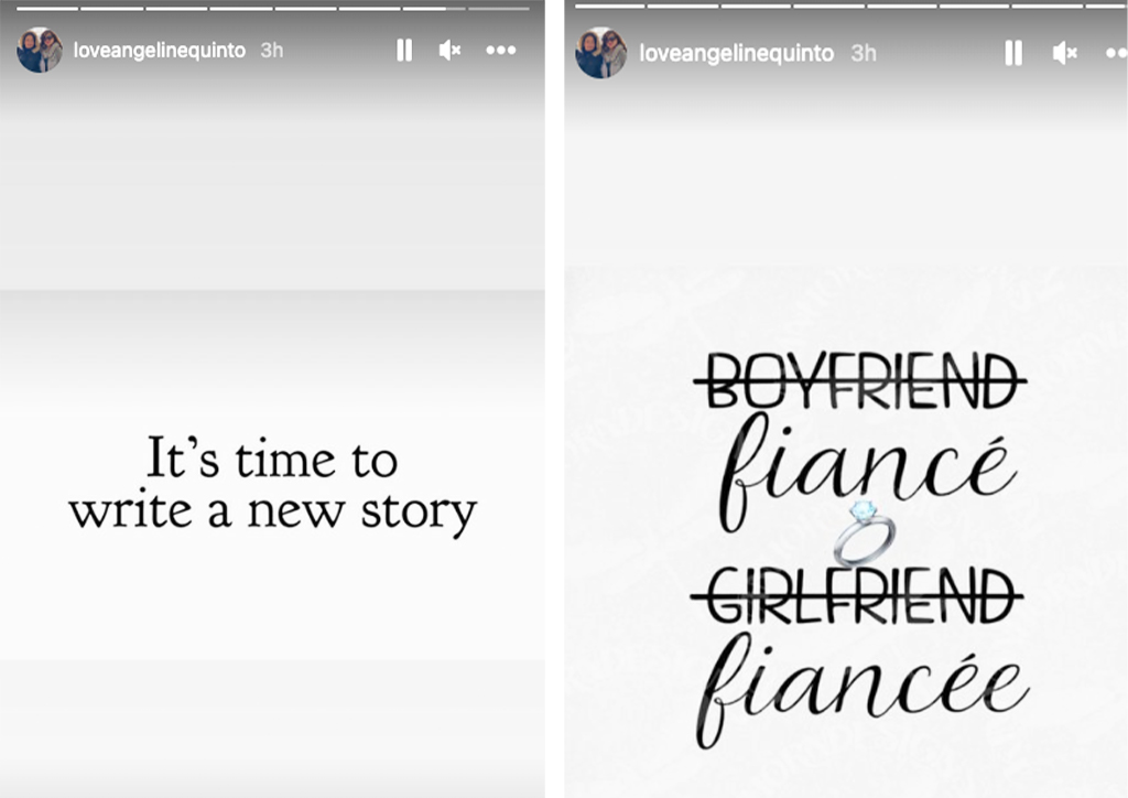 “It’s time to write a new story,” the first photo read. The second photo showed the words boyfriend and girlfriend crossed out and replaced with fiancé and fiancée.