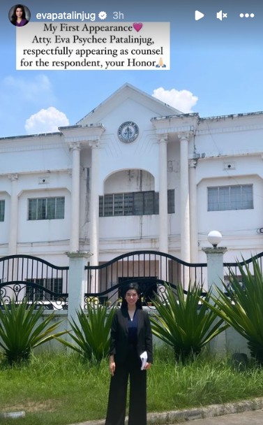 In one of her Instagram stories days after officially becoming a lawyer, Eva shared a photo outside of a courthouse, saying: “My first appearance. Atty. Eva Psychee Patalinjug, respectfully appearing as counsel for the respondent, your Honor.”