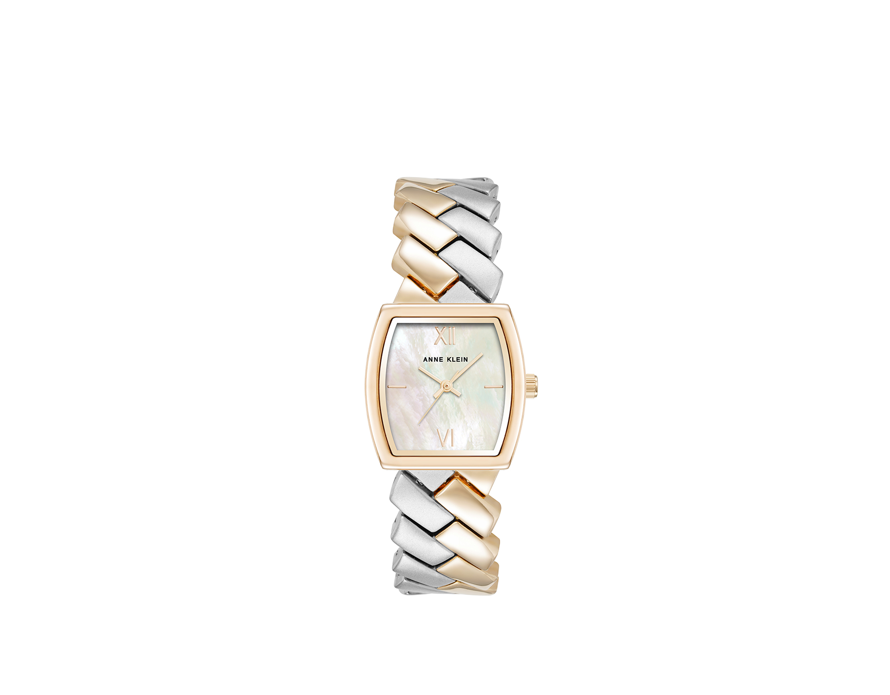 Treat yourself for the holidays with the Anne Klein Rectangle Cushion Watch with Mother of Pearl Dial, which strikes the perfect balance between classic elegance and modernity. Featuring a chic two-tone bracelet and a rectangular mother-of-pearl dial, this versatile timepiece effortlessly elevates any outfit with a touch of sophistication.