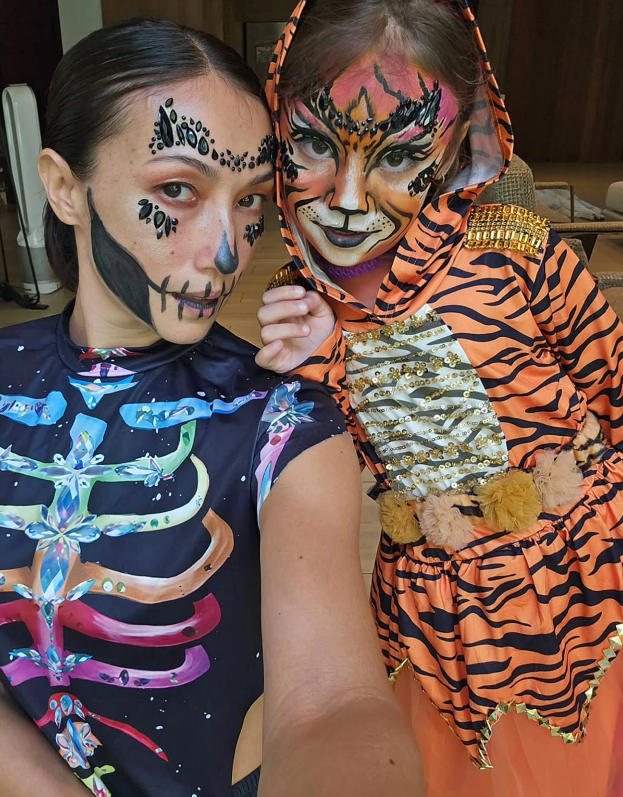 Over at the Bolzico household, Solenn and Nico took their daughters, Tilly and Maelys, for some fun. Solenn dressed up as a skeleton, utilizing her background as a makeup artist.