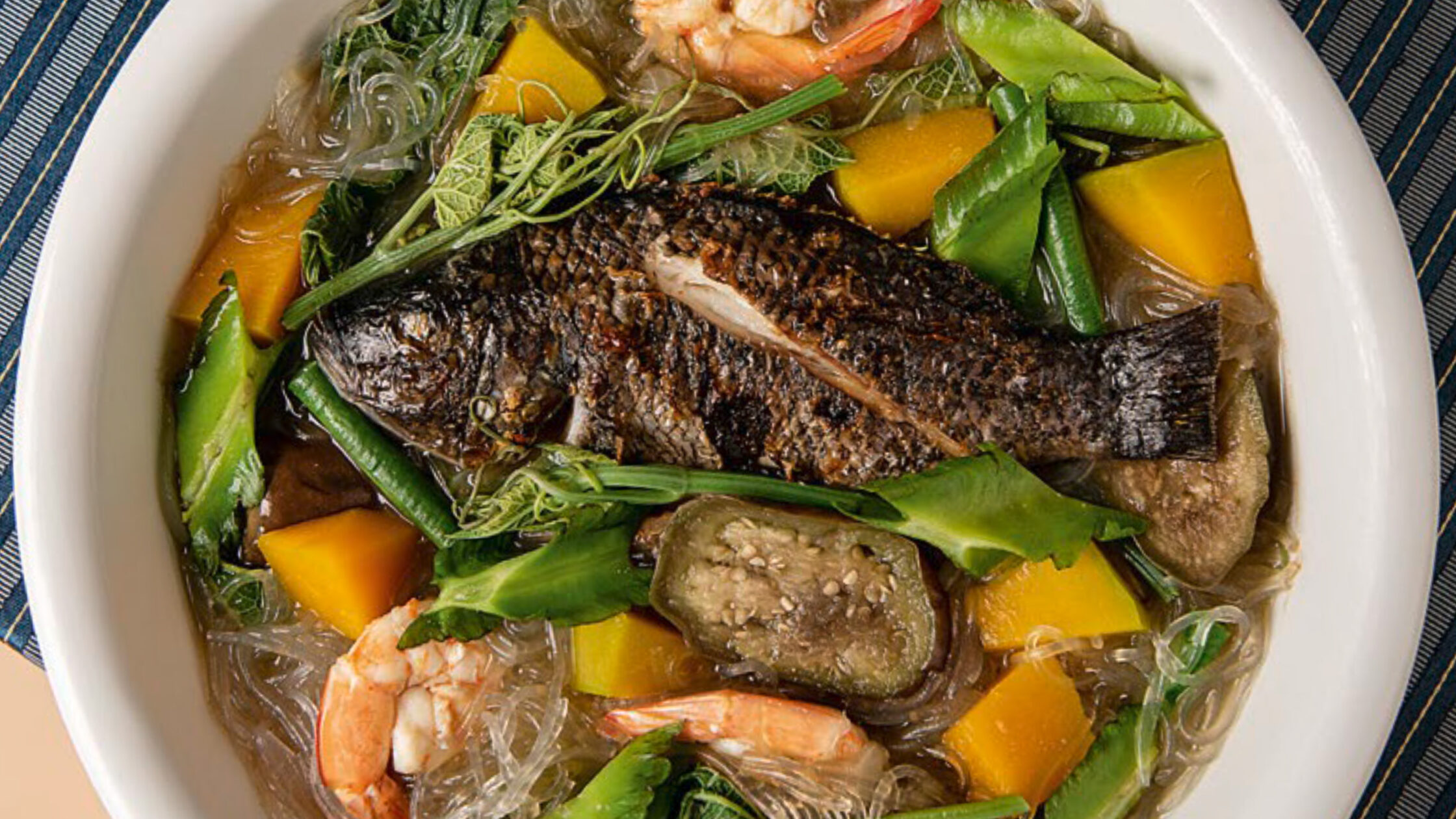 The dish mixes a medley of backyard vegetables, namely squash, okra, eggplant, and string beans. But this mixes it in a broth with seafood stock or fish sauce serving as the seasoning and base.