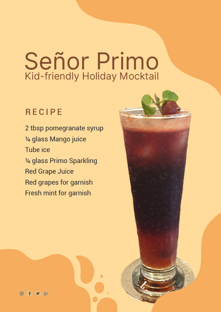 In a glass, mix the pomegranate syrup with the mango juice. Then, add some ice before adding Primo’s Sparkling Red Grape Juice. Make sure to mix it gently so it doesn’t splatter before garnishing it with the grapes and mint. The best part about the Señor Primo mocktail is that you can make one to treat yourself or you can make a whole carafe for the whole family to enjoy during the holidays.