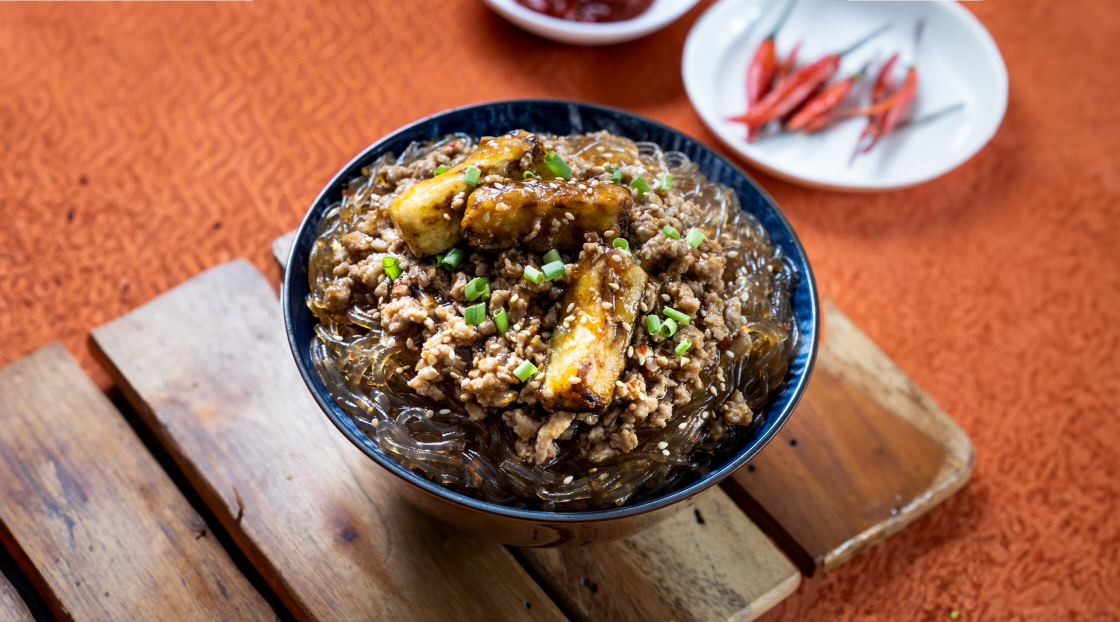 “I decided to translate that flavor profile into glass noodles – just to zhuzh it up a little,” she further explains. Simply put, this dish has soft and bouncy vermicelli noodles stewed in a sweet-spicy stock, generously topped with ground pork and fried eggplants strips. It’s not your garden-variety kind of