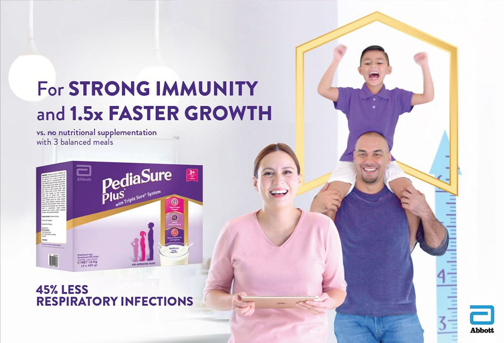 PediaSure Plus is a complete, balanced, nutritional supplement providing 100% of daily Recommended Energy and Nutrient Intakes (RENI) in children. Each glass is equivalent to 28 vitamins and minerals from a variety of fruits and vegetables, to carbohydrates equivalent to half a cup of steamed rice, to good fat equivalent to four tablespoons and a half of peanut butter, and to protein equivalent to a piece of medium-sized boiled egg, all of which are needed for a child to stay healthy and well-nourished. Altogether, PediaSure Plus encourages linear and visible growth in young kids. So, when they are back in school, children can catch up to their friends not only in height but also in productivity and in health.