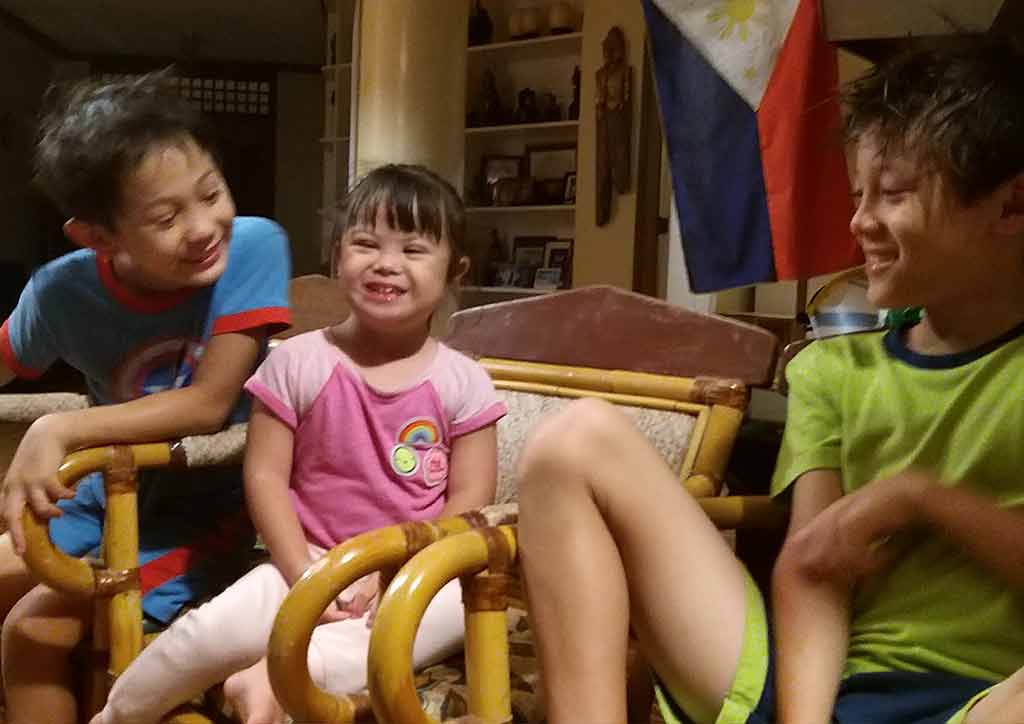 In the rambunctious Thomson-Guevara household, Akiko is proud that Sachiko can hold her own, even with two silly older brothers. “Sachiko is absolutely the boss of them both,” says Chips, “The boys are also her physical therapist. Because of them, she’s become stronger — she has to defend herself against their smothering her with kisses!”