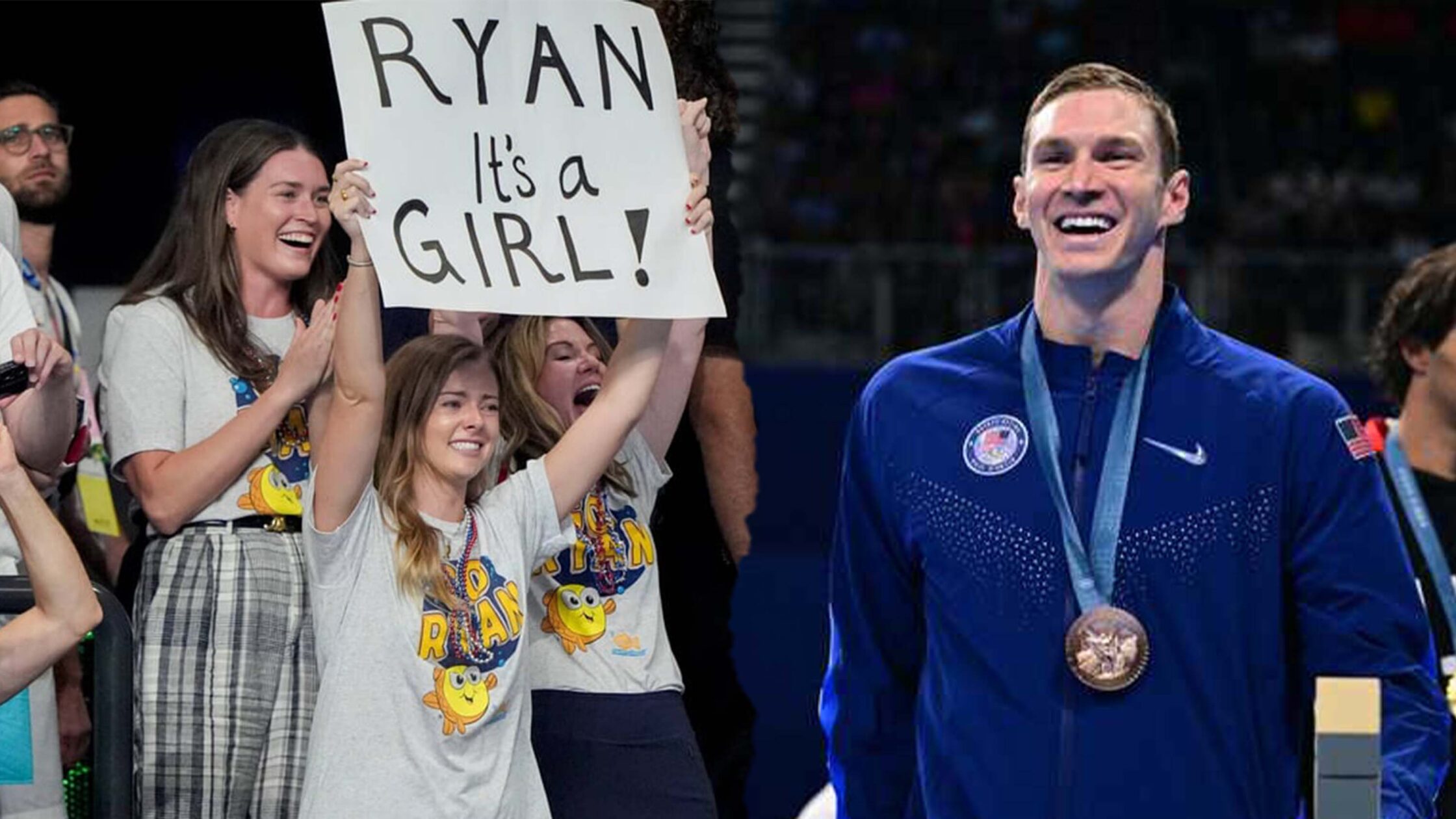 Who knew he was up for another surprise after his event? After swimmer Ryan Murphy secured a bronze medal for the 100m backstroke for Team USA, he spots his pregnant wife, Bridget Konttinen, and his family holding up a poster: “RYAN, IT’S A GIRL!” It’s quite the gender reveal and now the whole world can celebrate with Ryan that his first child is a baby girl!