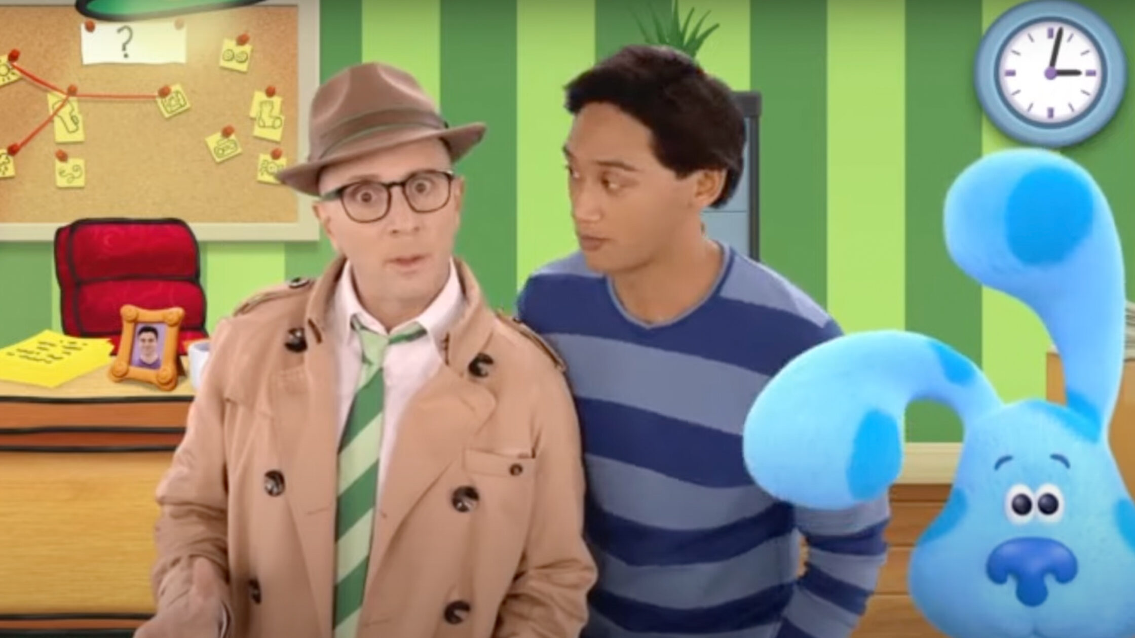Steve Burns recently returned to the World of Blue’s Clues for another episode. In a trailer, the original host wore a fedora hat as he helped our friendly dog and Josh de Cruz solve the “Mystery Of The Missing Chair.”