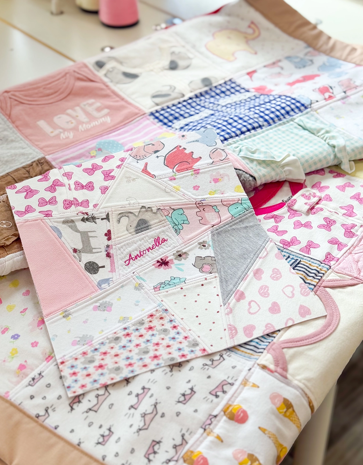“We don’t simply cut them into uniform squares,” she explains. “Instead, we take time to preserve meaningful details such as pockets, collars, ruffles, buttons, smocking, embroidery, and even small imperfections that carry memory.”