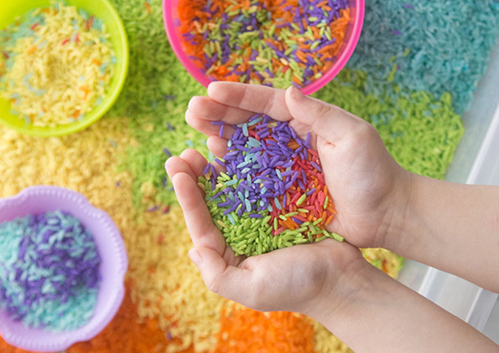 Children need not only play with their sensory bins but also enjoy taking part in the preparation. They enjoy shaking the rice and watching it change colors. With the use of fine motor tools, children can scoop, pour, and even dump colored rice in the bin. For added fun, you may put some animals or even kitchen toys.