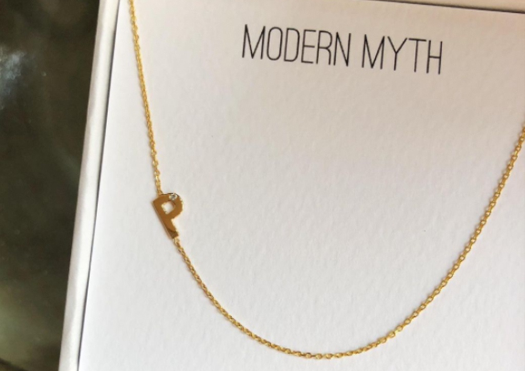 Keep it minimalist with Modern Myth‘s personalized designs. This slanted initial necklace is dainty enough to wear everyday, complete with an embedded diamond stud set in 18k gold.