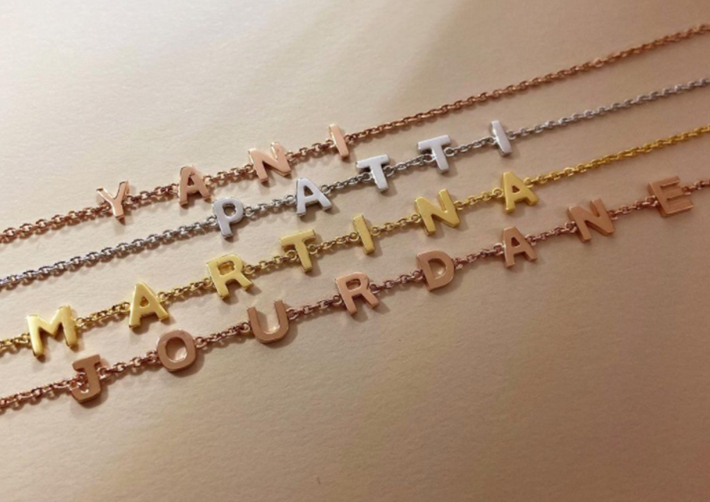Fine jewelry brand Lourel creates bespoke name necklaces and bracelets in 14k yellow, white or rose gold. We love this simple custom made piece that’s sure to start a conversation or two.